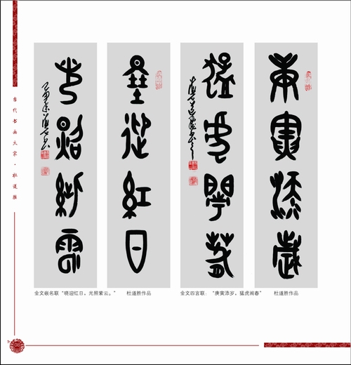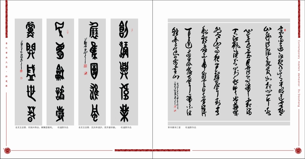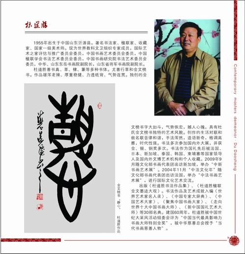 杜道胜自幼酷爱书法艺术,后久居军旅,原是一名中国人民海军。多年来,深受海的洗礼,不仅使他事业有成,而且他的书法艺术也取得了辉煌的成就。他善书真、草、隶、篆,尤善行草和金文榜书。草书作品注重整体效果,厚重稳健,气势连贯;金文作品鉴古不惟古,以变求新,深受书法爱好者和藏家的青睐。特别是独创的杜氏金文榜书,格调高雅,气势恢宏,集艺术性、观赏性和装饰性为一体,成为书界一道亮丽的风景线;篆书作品追求金石味,行笔颤动,个性鲜明;隶书作品师法自然,雄浑老辣,风格新奇。其书法作品多次参加国内外大展赛,先后获金、银、铜、优秀奖及一、二、三等奖多次。2009年9月随文化部书画代表团出访新加坡,举办“中新书画艺术展”。2004年11月“中法文化年”随文化部书画代表团出访法国,举办“中法书画艺术展”,进行国际文化艺术交流。他擅长楹联创作,创作的300余幅风景、生活对联和嵌名联音律和谐,手法浑然,造语奇特,格调高雅,时代性强,深受人们的喜爱。书法及楹联作品,先后在法国、日本、新加坡、泰国、韩国等国家及台湾、香港、澳门和文化部、中国历史博物馆、美术馆展出,并在新加坡《新民早报》、《新民晚报》,法国《星岛日报》、《欧洲时报》及国内相关报刊发表。